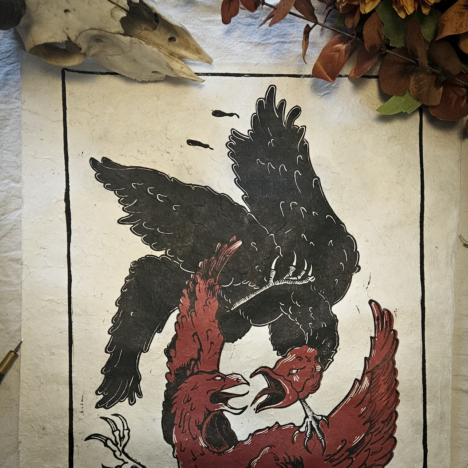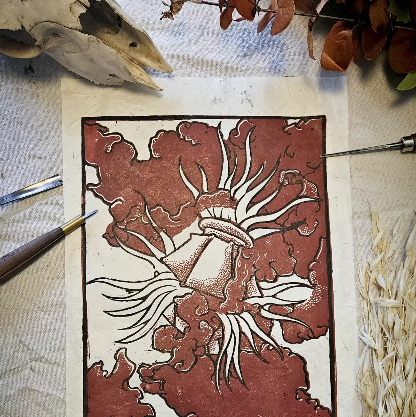 Impression Manuelle : Cette linogravure est une pièce unique, façonnée à la main dans l’atelier. Chacune des estampes tirée de cette gravure comporte des variations subtiles qui la rendent unique à son tour.